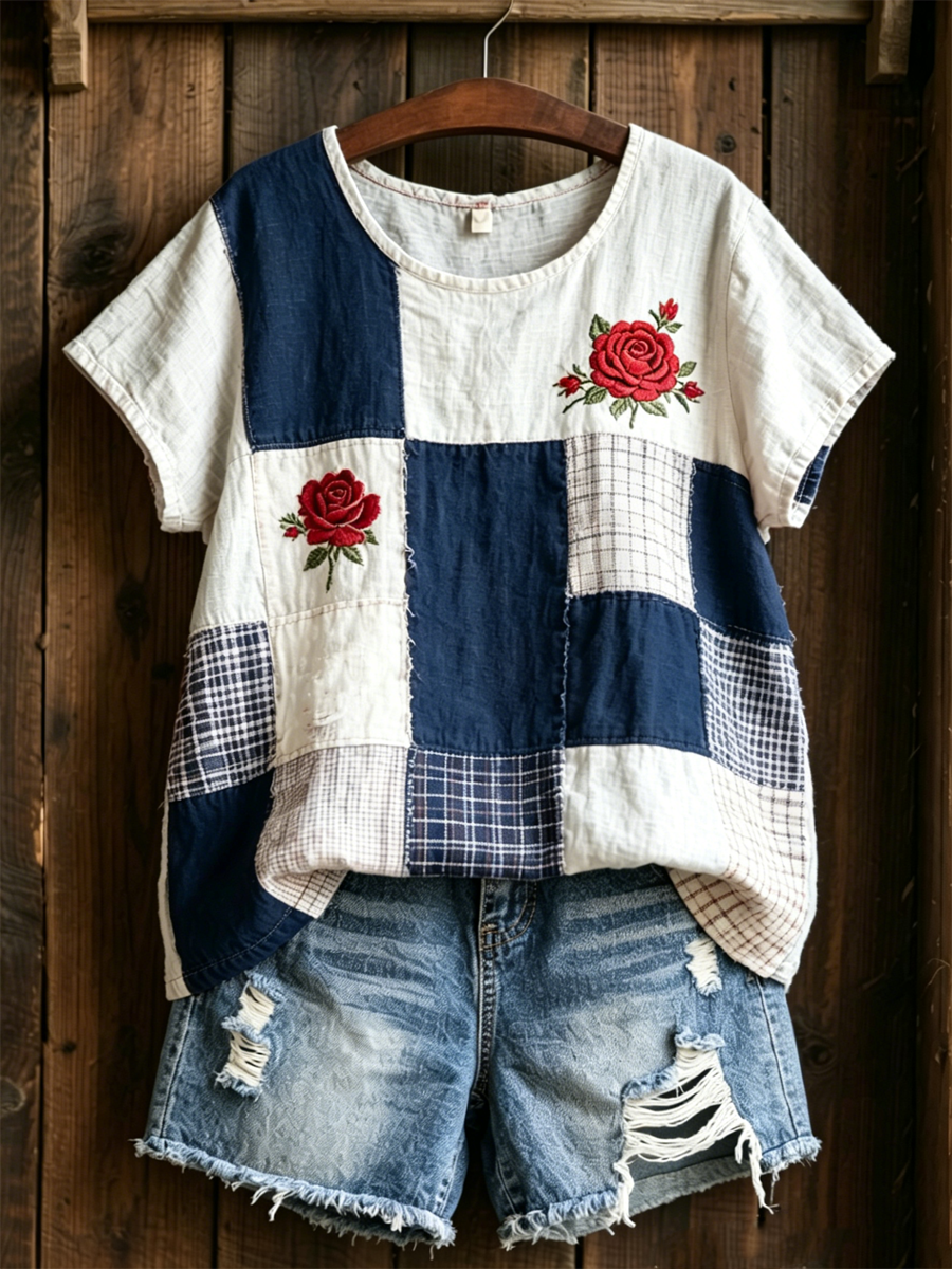 Women's Rose Print linen short-sleeved T-shirt