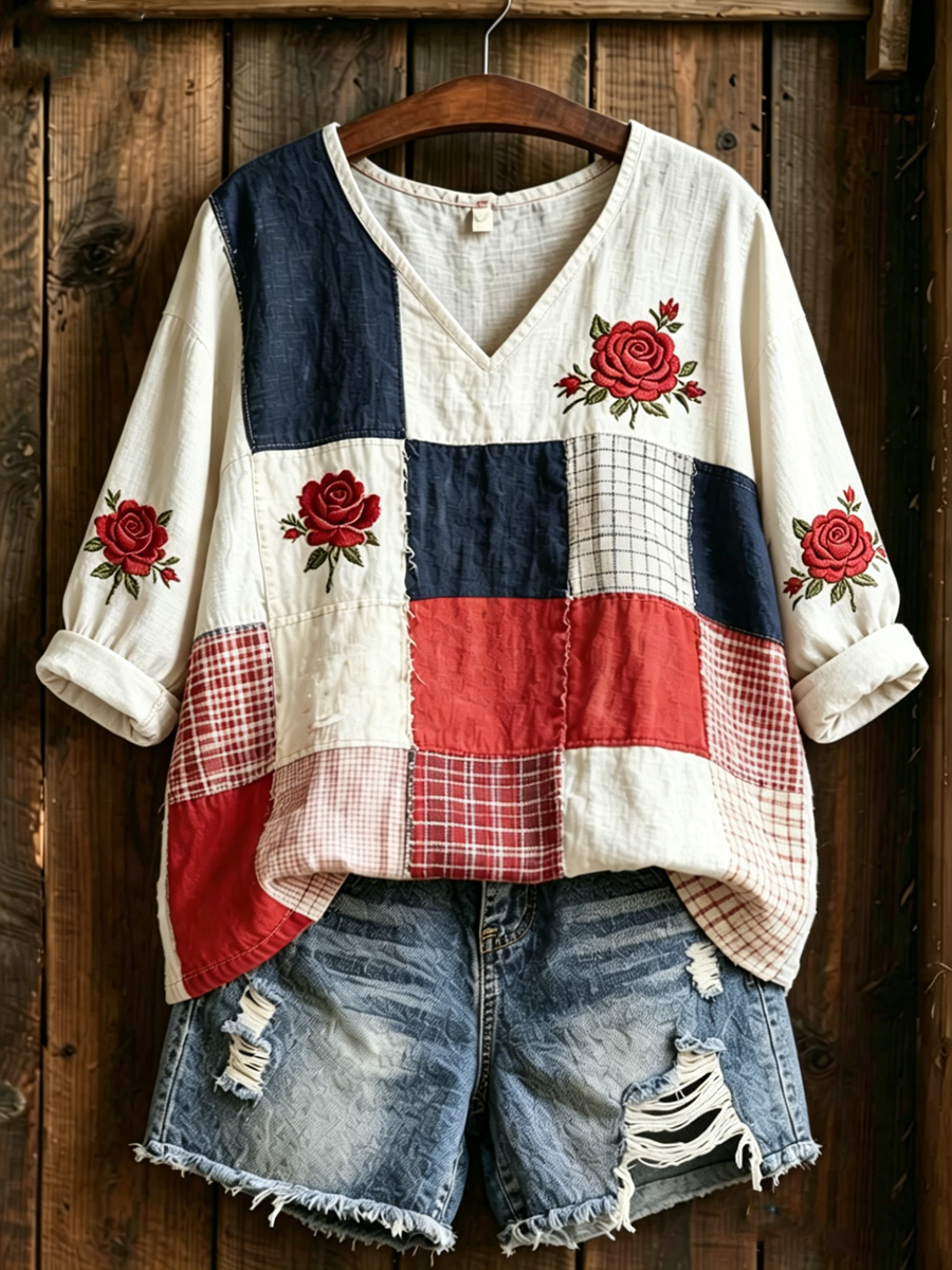 Women's Floral Print Mid-length Sleeves V-Neck T-Shirt