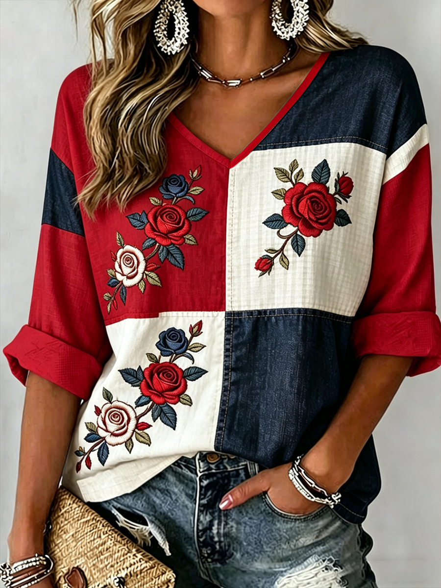 Women's Floral Print Mid-length Sleeves V-Neck T-Shirt