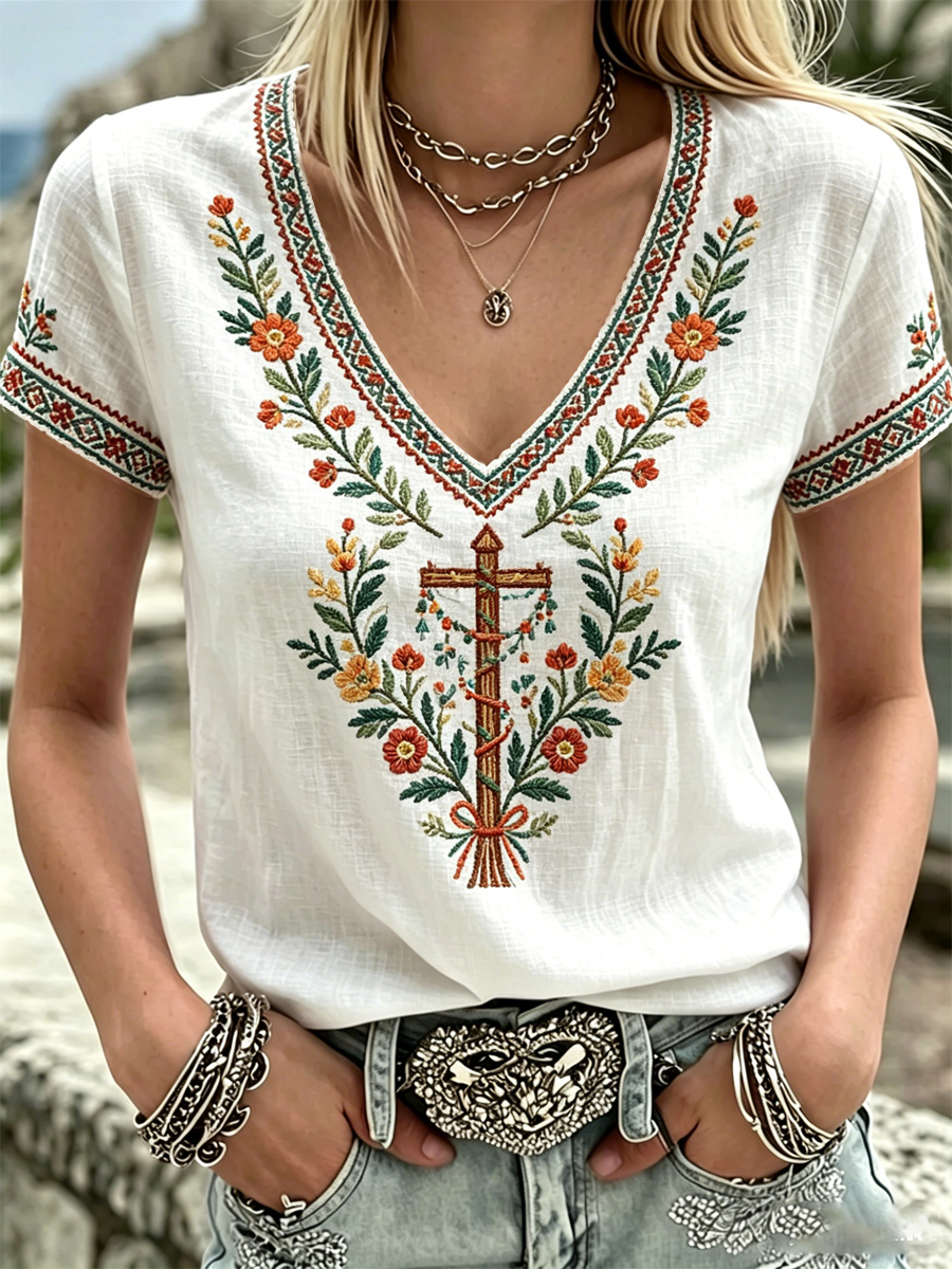 Women's Midsummer Print V-Neck Casual T-Shirt
